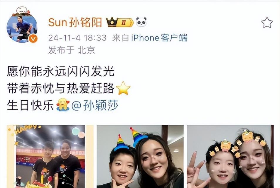 关系藏不住了?孙铭阳附爱称为孙颖莎庆生,原来真相早有预兆 今天孙颖莎过生日啦,好多人都给她送了祝福呢!作为国乒的 “小魔王”,她球打得好,人缘也特别棒。 零点一到,孙铭阳就上网发了博文提莎莎,准时给她庆生,还亲切地叫她 “小胖墩”。博文里还附了两人的合照,照片里孙铭阳穿着浅紫色训练服趴在球桌上,莎莎则趴在她身上,穿蓝色上衣比了个手势,俩人一起看着镜头,脸上都笑盈盈的,特别开心。细心的球迷发现,这可不是阳阳第一次给莎莎庆生,她都连续八年送祝福了!其实俩人小时候就认识,都在河北队待过,一起训练、一起比赛好长时间。莎莎还是小球员的时候,阳阳就一直陪在她身边当陪练,莎莎的成长阳阳可都看在眼里呢。她们不光在赛场上配合得特别默契,私下里也是特别好的朋友,经常在网上互动,特别亲密。
